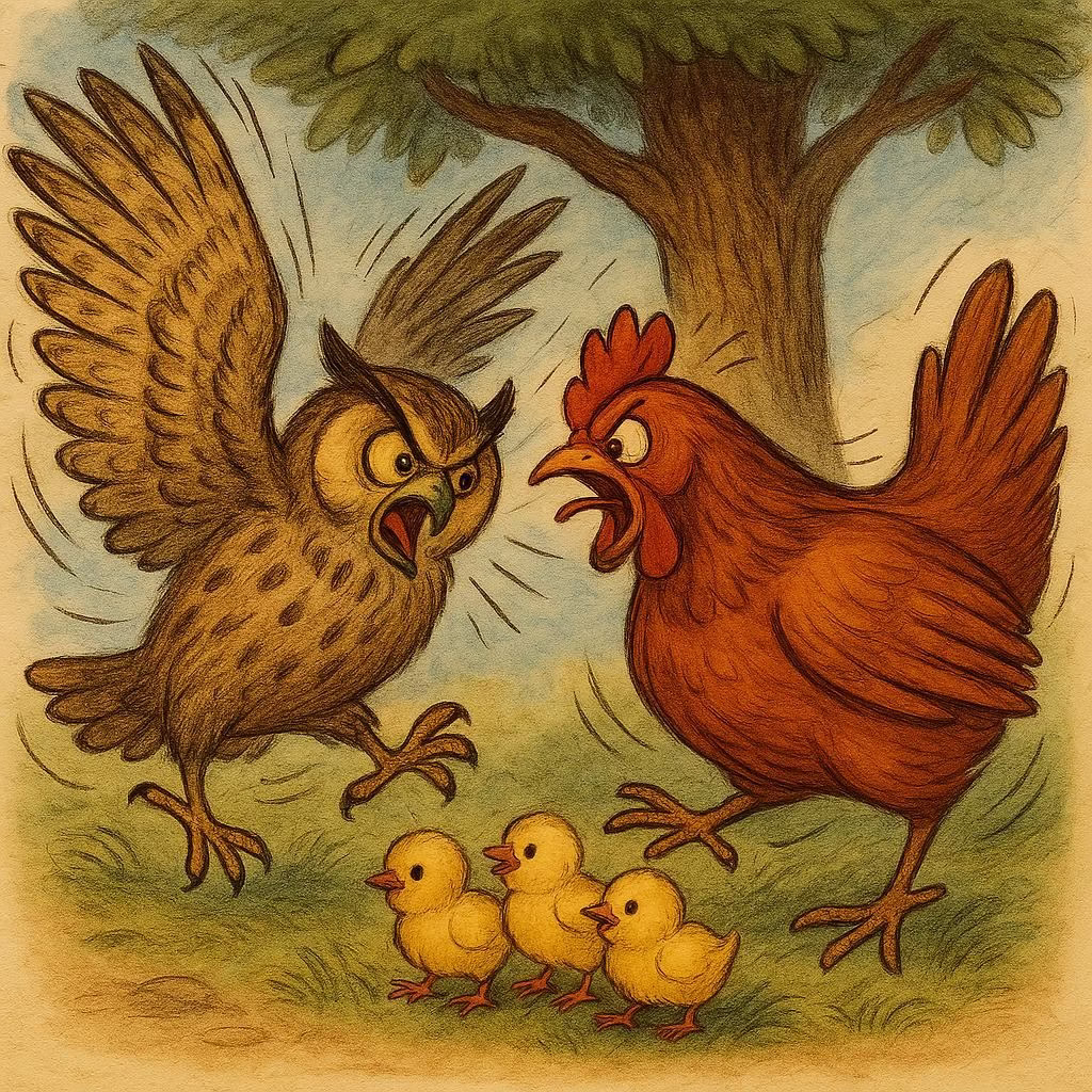 Subax ayaa digaagadu caruurteeda la baxday si ay cunto u raadsadaan. Iyagoo ku raaxeysanaya qorraxda, ayaa si lama filaan ah Guumays (shimbir weyn oo hilib cun ah) ka soo muuqday cirka.