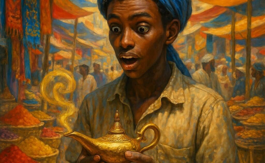 Aladdin wuxuu ahaa wiil sabool ah. Maalin nin cilmi yaqaan ah ayaa laambad yar siiyey. Markuu gacan ku xoqay, jinni weyn ayaa soo baxay! Jinnigu wuxuu yiri: “Wax walba waan kuu sameynayaa.” Aladdin wuxuu helay qasri, dahab iyo boqorad uu guursado. Laambadda sixirka ayaa noloshiisa bedeshay.